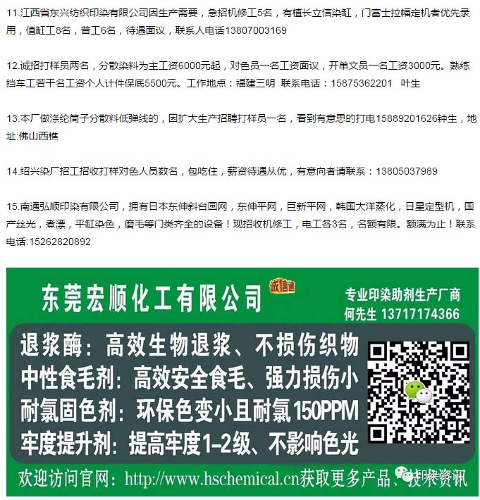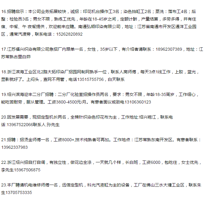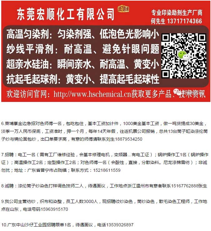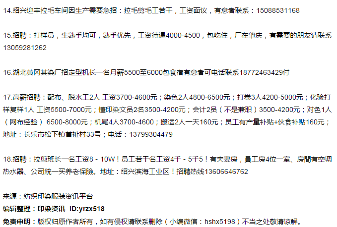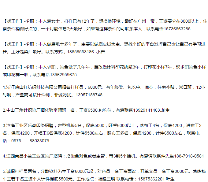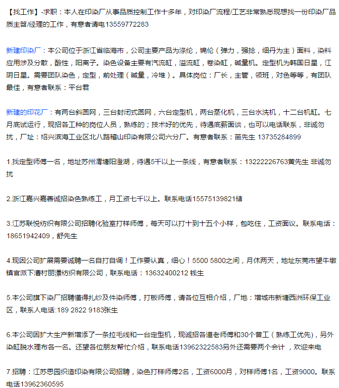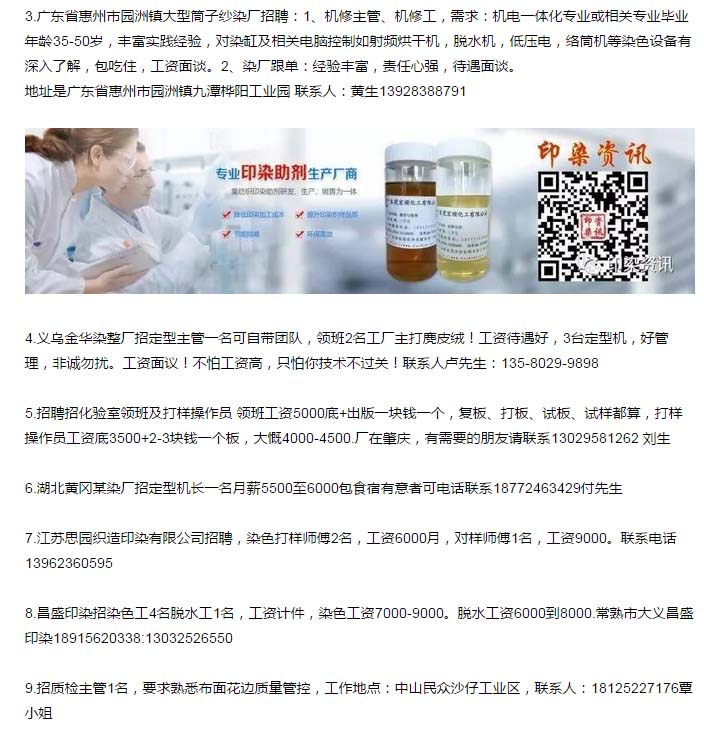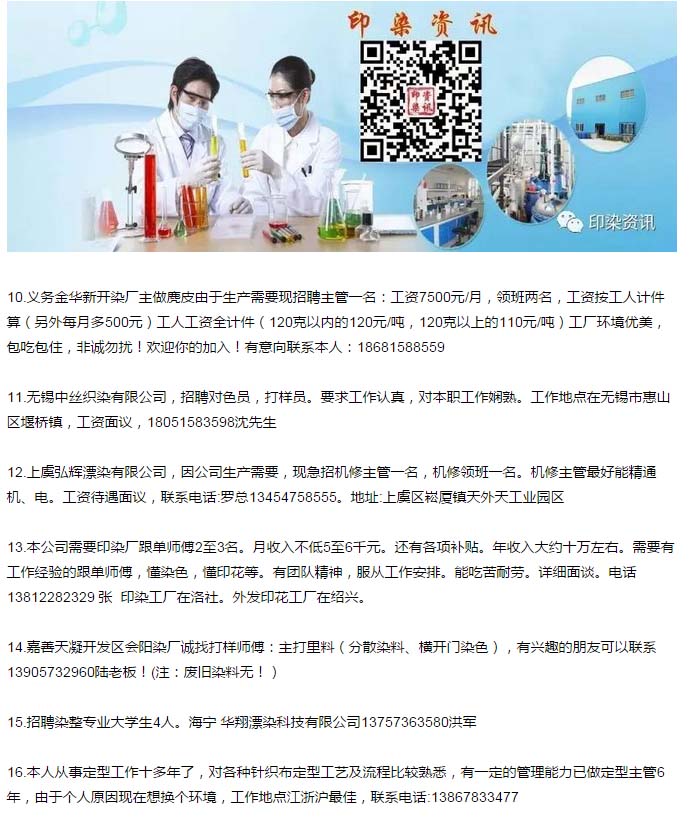 招聘丨染色主管-对色-化验室领班-电工-调色-跟单-印花