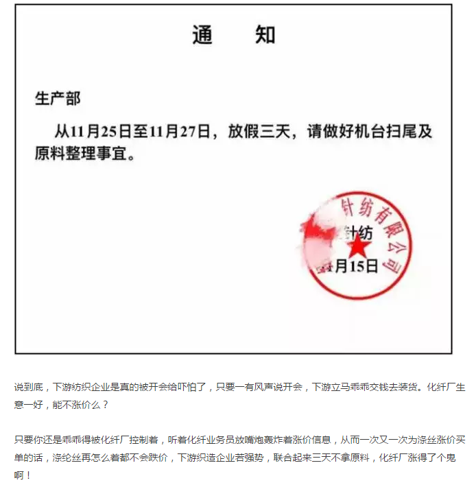 核心提示:昨天周一,依然又是无休止的充斥着化纤联谊会联合涨价的“噱头”,又或是各种PTA涨,还是原油涨还是MEG涨,总之各种能尽之的炒作理由都被化纤厂翻遍了,搞得下游甚至都找不到任何可以不进原料的理由。