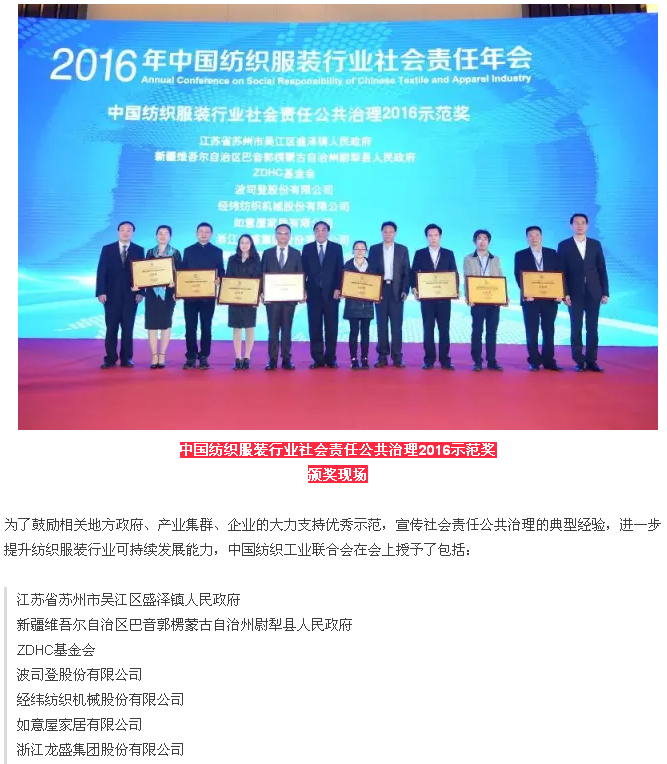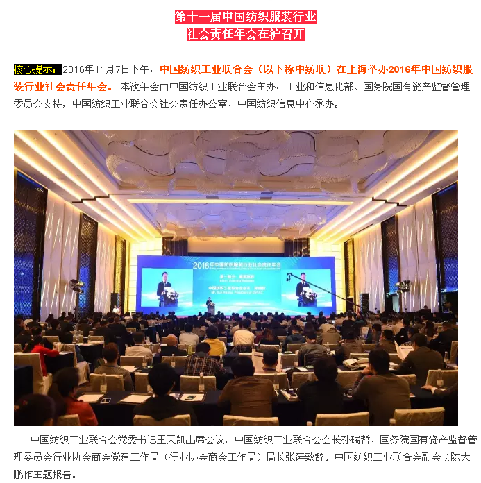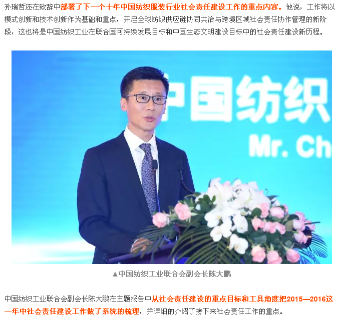 陈大鹏还在会议上阐述了纺织行业最新的12个社会责任发展目标,包括体面劳动、社会对话、性别平等、青年发展、绿色制造、环境友好、可持续创新、负责任供应链、负责任投资、负责任消费、尊重产权和诚信竞争。他说:“这是我们面对联合国可持续发展可持续发展目标和实现国家建设生态文明和全面建成小康社会的产业解决方案。”