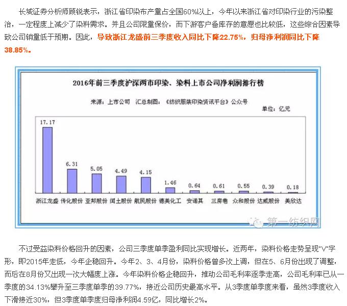 导读:《纺织印染服装资讯平台》10月29日专稿:据该公众号记者不完全统计,截止10月28日早间,沪深两市11家纺织印染、染料上市公司陆续发布2016年三季度业绩公告。