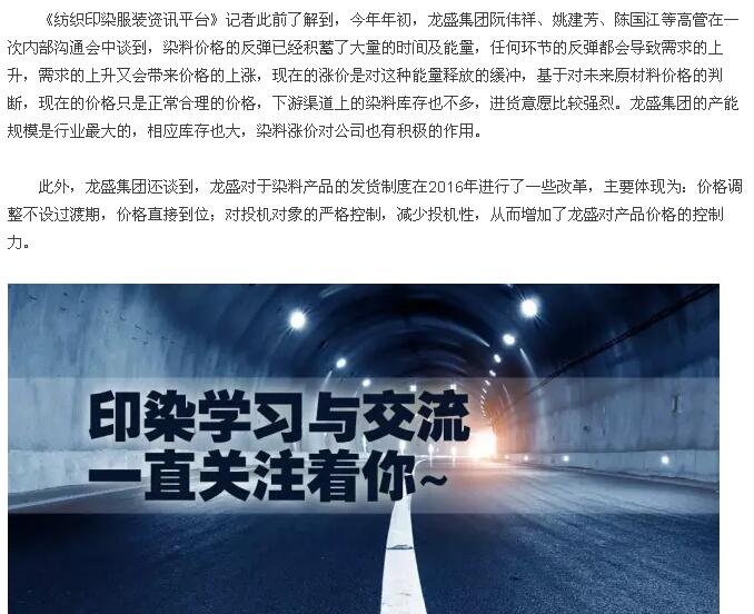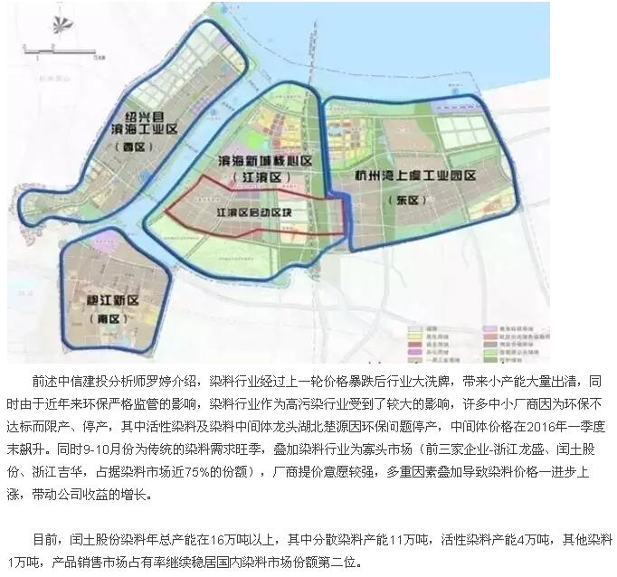 总体来看,在印染的成本构成中,染料占印染成本比重低,约10%左右,因此下游印染企业对染料提价的接受能力较强。今年以来,绍兴地区启动对印染产业的重点整顿,加快推动印染产业从中低端向中高端转型,因此大量中小印染企业的停产,导致市场需求格局发生变化,印染订单向大型企业集中,使得大型企业开始满负荷运转,染料需求开始转旺,在成本推动+环保驱动+下游接受度提升+旺季来临,染料有望迎来新一轮景气行情,包括闰土股份、浙江龙盛、安诺其等上市公司在内的动向,也值得业界人士为之高度关注。
