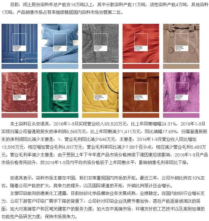 本土染料及染料中间体上市公司闰土股份,2016年1-9月份实现营业收入30.53亿元,与去年同期相比下降10.29%,实现营业利润5.37亿元,与去年同期相比下降32.24%,实现利润总额5.46亿元,与去年同期相比下降35.36%,归属于母公司股东的净利润4.41亿元,与去年同期相比下降35.18%。