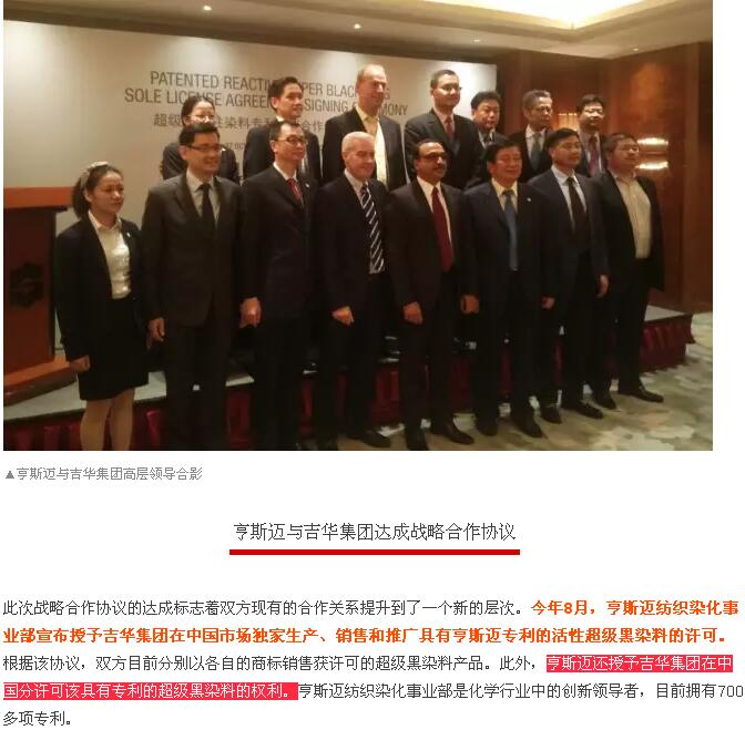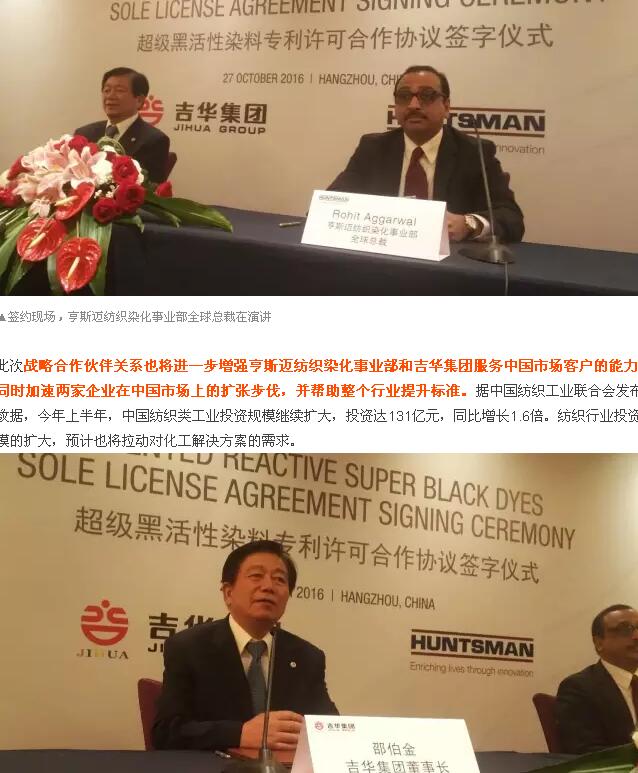 核心提示:中国杭州,2016年10月27日——亨斯迈纺织染化事业部 (NYSE:HUN) 今日与浙江吉华集团签署战略合作协议。根据此协议,双方将在一系列广泛的领域开展合作,以满足中国纺织行业对于染料化学品解决方案持续增长的需求。这一合作也将促进提高双方的供应链效率,以更快地满足客户的需求,并帮助他们提升成本效益。