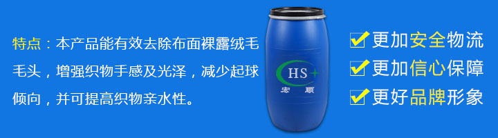 本产品能有效去除布面裸露绒毛、毛头,增强织物手感及光泽,减少起球倾向,并可提高织物亲水性。【使用方法】