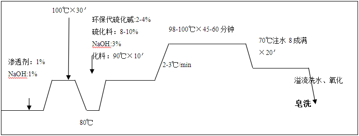 1、本品用量是硫化染料用量的20-40% 2、染色工艺:渗透剂、烧碱常温化开直接加入后快速升温至100℃保温30分钟,降温到80℃后回水化料,环保助染剂、硫化料与烧碱于副缸搅拌约10min(升温至90℃),注入主缸,约10-15min后升温至98-100℃保温45-60分钟,降温至70℃入水至主缸8成满,运行15-20min后溢流洗水、氧化(建议先注水后排水,有利于织物充分还原氧化)。 3、染色曲线: