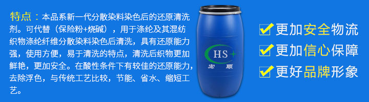 1、本品在弱酸性条件下具有对分散染料强还原作用,彻底去除织物上未固着的染料,去除浮色能力好; 2、本品使用方便,易于还原清洗,清洗后织物更加鲜艳,牢度更高,不会有保险粉恶臭味及危险性, 3、和传统的碱性还原相比,对于染浅色和染色后脚水浅的染色液,仅需调PH值和加入本品即可还原清洗,能缩短涤纶分散染料染色还原清洗的时间,节约蒸气、省水,缩短工艺;【使用方法】
