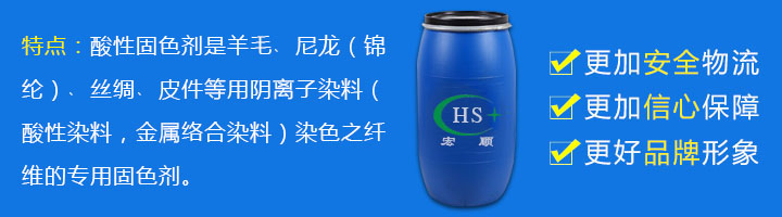 1、酸性固色剂是羊毛﹑尼龙(锦纶)﹑丝绸﹑皮件等用阴离子染料(酸性染料,金属络合染料)染色之纤维的专用固色剂,经处理后的染色物,其水洗坚牢度、汗渍牢度等得到极大提高; 2、对织物色光,手感影响甚微; 3、可以染色、固色同浴进行,缩短工艺流程。 4、该产品的另一特点是具有很好的耐酸性,利于化料操作。
