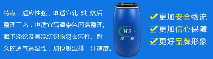 1、适应性强,既适宜轧-烘-焙后整理工艺,也适宜高温染色同浴整理; 2、赋予涤纶及其混纺织物易去污性、耐久的透气透湿性,加快吸湿排汗速度; 3、对有色织物的色光影响基本无影响; 4、染色同浴整理时可防止涤纶在溢流染色机中因长时间挤压而产生的折痕、鸡爪印等疵病,赋予染色织物膨松、柔软的手感; 5、特别适宜于针织运动衫,运动袜等织物。【使用方法】