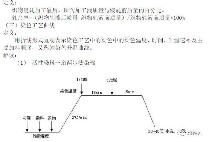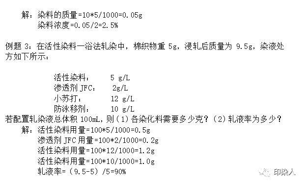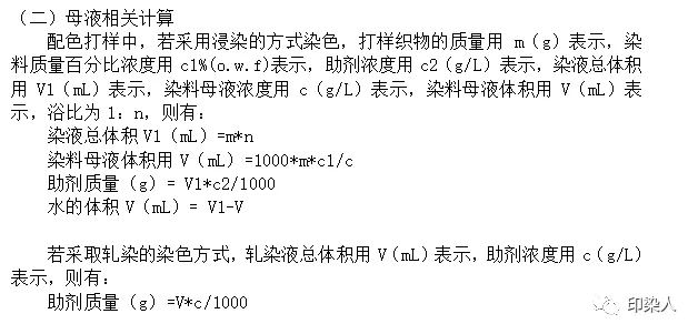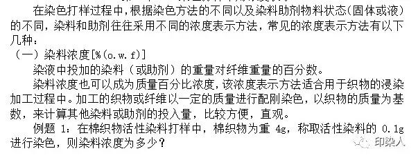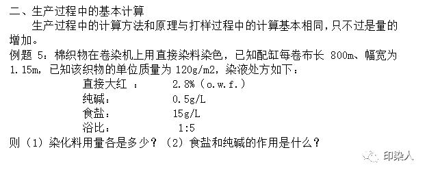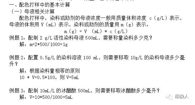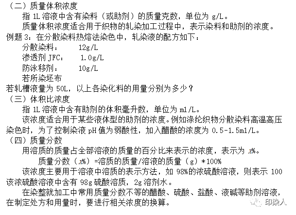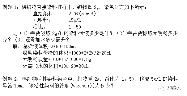 (1)在实际应用中常把染液的密度当作1来处理。浴比有大小之分:1:20,1:30为大浴比;1:3、1:5为小浴比。生产上米采用小浴比,用液量较少。实验室打小样采用大浴比打样。