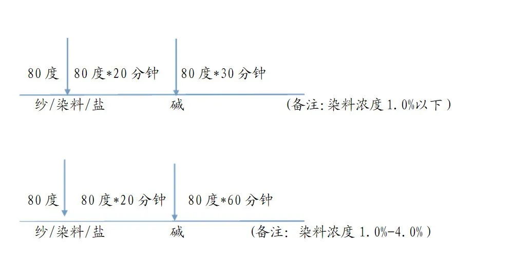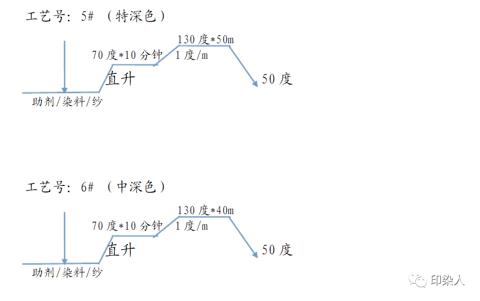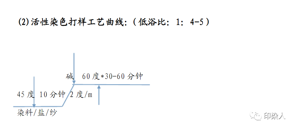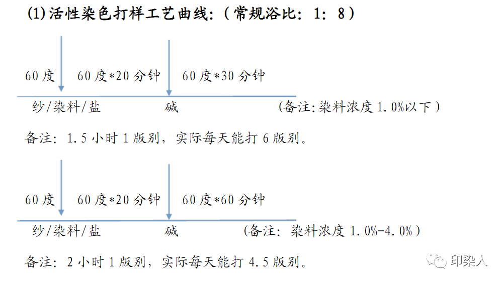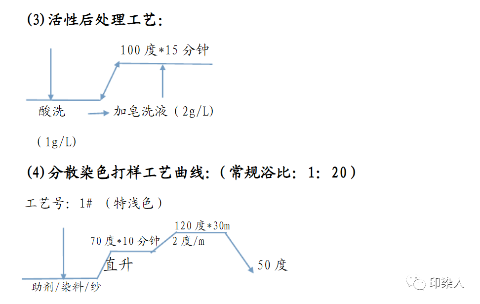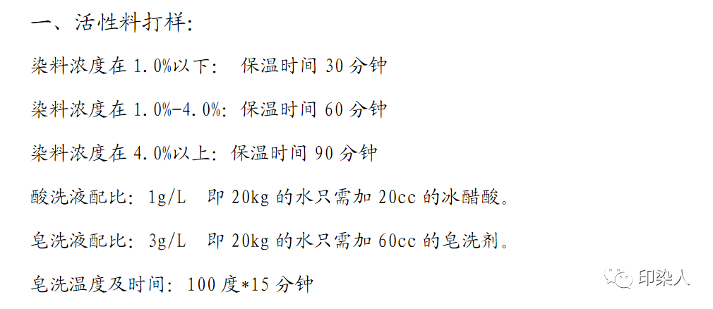 5、所有染料必须写全称,活性染色写明元明粉及纯碱的用量(如盐50g/L,碱:18g/L),以及染色温度与时间(如:60度*60分钟,80度*60分钟),分散染色应写明匀染剂及酸的用量(如:**1g/L,酸0.5g/L),以及染色温度与时间(如:130度*40分钟),其他染料染色也一样,只要打样时用到的助剂以及温度、时间都必须写明。
