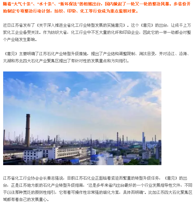 核心提示:近几年,纺织化纤行业一直弥漫着环保整顿的气氛,自2013年之后,伴随监管力度的逐渐加大,其对行业的影响也是不言而喻。而自2016年以来,环保“紧箍咒”一浪接一浪。