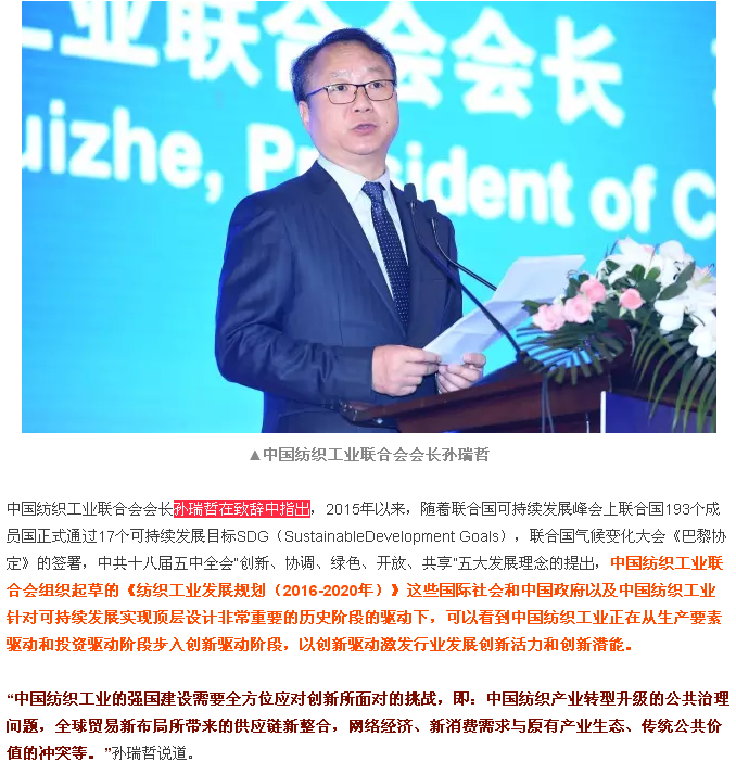 陈大鹏还在会议上阐述了纺织行业最新的12个社会责任发展目标,包括体面劳动、社会对话、性别平等、青年发展、绿色制造、环境友好、可持续创新、负责任供应链、负责任投资、负责任消费、尊重产权和诚信竞争。他说:“这是我们面对联合国可持续发展可持续发展目标和实现国家建设生态文明和全面建成小康社会的产业解决方案。”