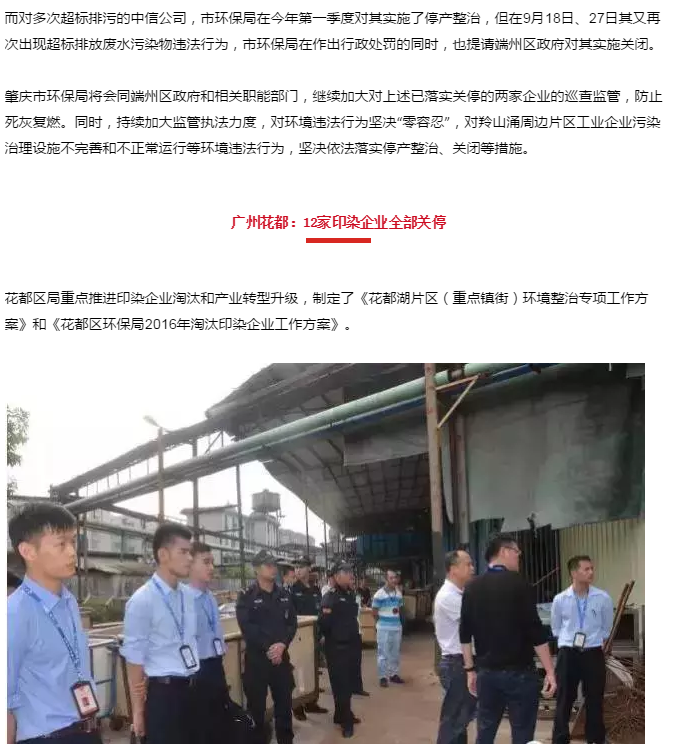 核心提示:就在河北保定市对高阳全县75家染厂限产停产整治的同时,远在南方的广东也在进行环保大整治行动。近日,汕头,肇庆,广州,东莞等地印染企业违规排污现象严重,各地政府部门联合执法,对印染行业进行环保大练兵!