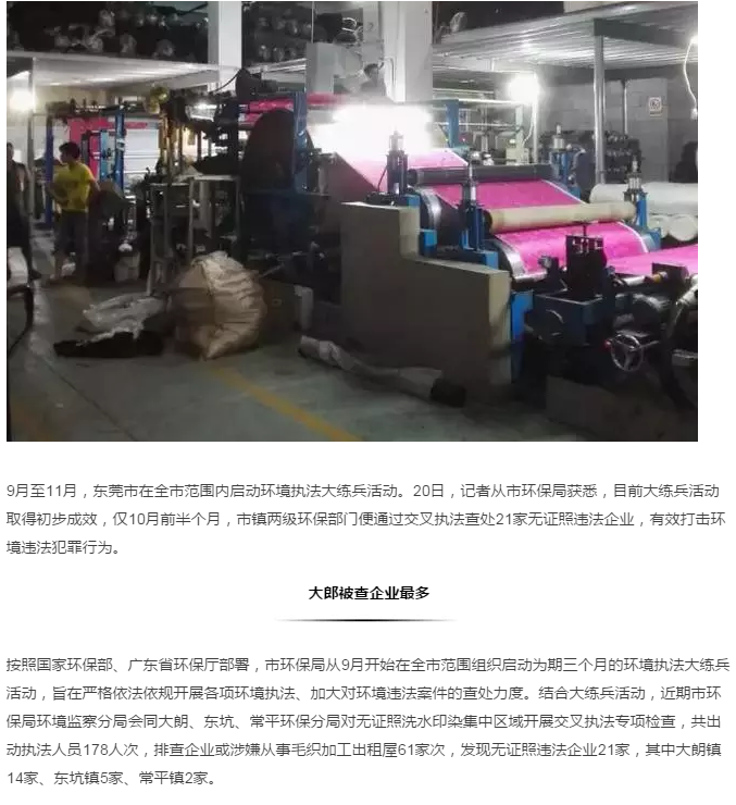 东坑镇经排查未发现新的无证照洗水企业,经对2015年排查发现的5家无证照违法企业进行再次检查,5家企业均已全部关闭搬迁。常平镇的2家无证照企业,其中1家毛织洗水企业已被常平分局立案查处,另一家擅自设置锅炉企业已移交常平分局跟踪调查取证。