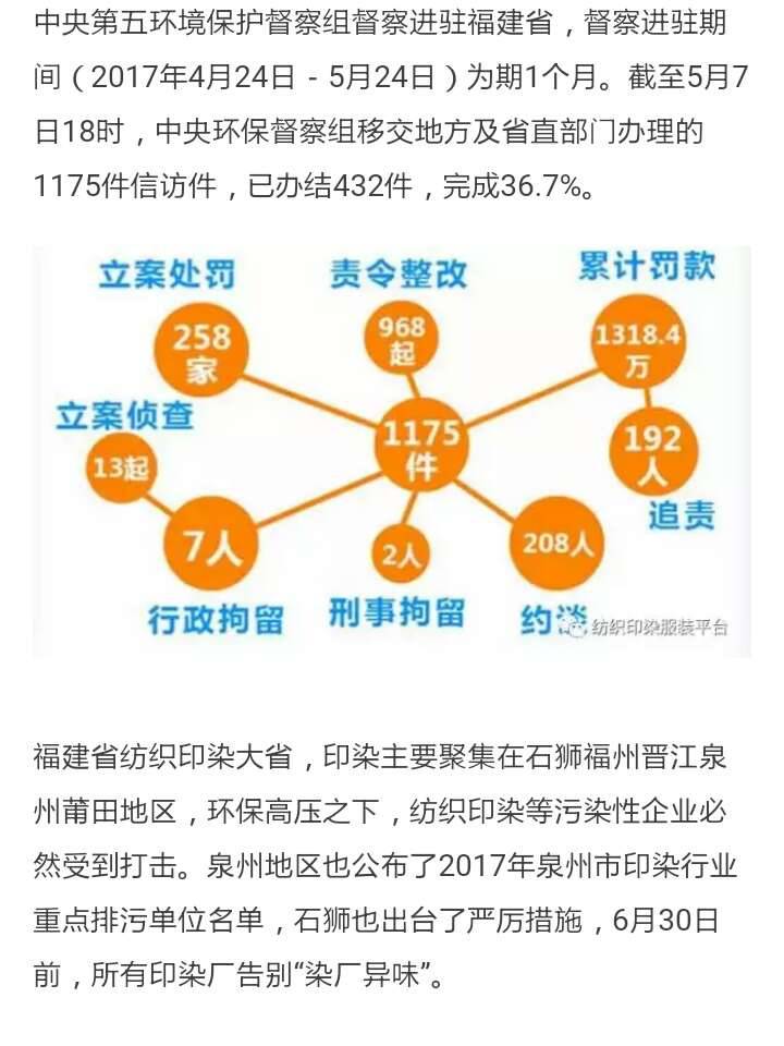 据平台君了解,石狮印染企业有60余家,自去年8月份至今,一直处于排污限排,产能受限的状态。新的污水处理厂正在抓紧扩建,需要一定的时间去完善和验收。旧的污水处理厂又无法满足所有印染企业满负荷排污,只能对印染企业进行限排。今年年初,对所有印染厂排污口安装了监控预警系统,达到了设定的指标,自动关闭阀门,印染厂将无法排污,不得不停产或控制开机数量,产能大大的受限。
