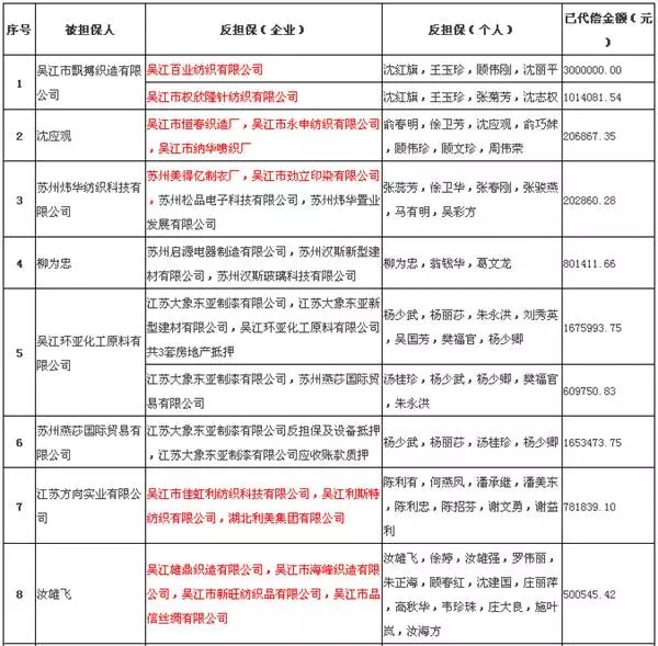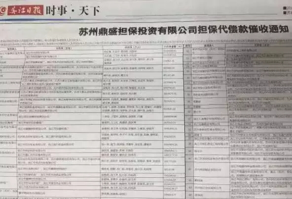 2015年12月23日,苏州鼎盛担保投资公司在吴江日报时事天下版,用了近半个版面刊登了该公司作为债权人,要求被担保人及反担保人偿还代偿款的催收通知。该催收通知详细的列出了被担保人和反担保企业和代偿金额,小编细数了下其中纺织企业占了近9成。